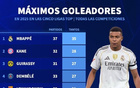 2025年至今五大联赛射手榜:姆巴佩35球居首,凯恩28球第二