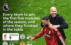 直播吧9月21日讯 英超前5轮比赛,利物浦5战全胜,积15分排名积分榜首位。据英超官方统计,英超历史上共有14支球队赛季开局5连胜(包括本赛季利物浦),此前做到这点的13支球队之中,4支球