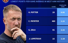 北京时间9月20日,在英超第5轮的比赛中,西汉姆联主场1-2不敌水晶宫,遭遇两连败,目前他们仅以1胜4负的成绩位列积分榜的倒数第三位。赛后根据德转的统计,自波特今年1月接手西汉姆联