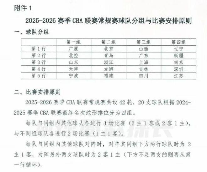 虽然新赛季的CBA联赛要等到12月开打,不过各项工作都在有序进行。据媒体人“球圈赵探长”透露,CBA公司已经将《2025-2026赛季CBA联赛常规赛分组与比赛安排原则》下发给了各队,来