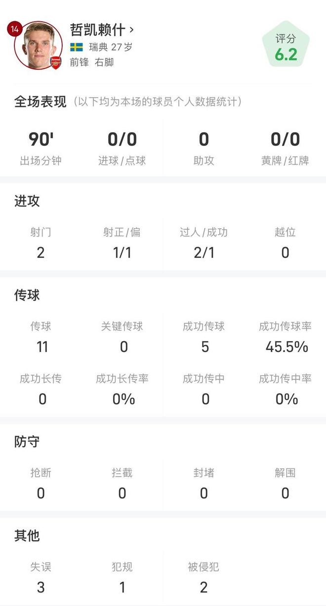 哲凯赖什vs西汉姆联数据:2射1正,传球成功率45.5%