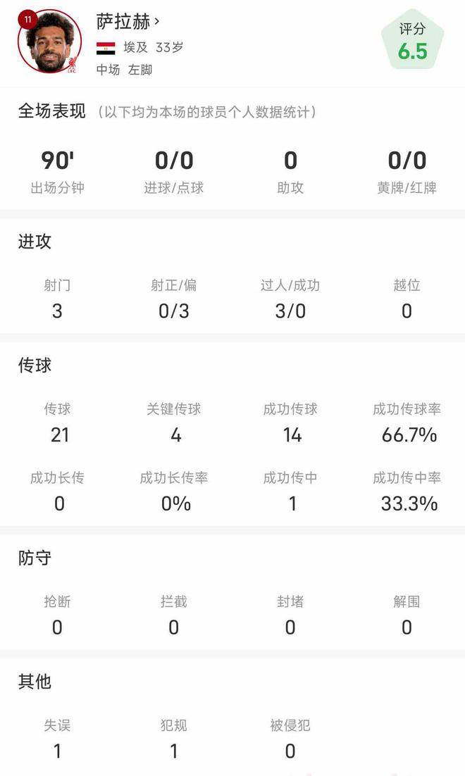 在场上,萨拉赫有1次失误,1次犯规。